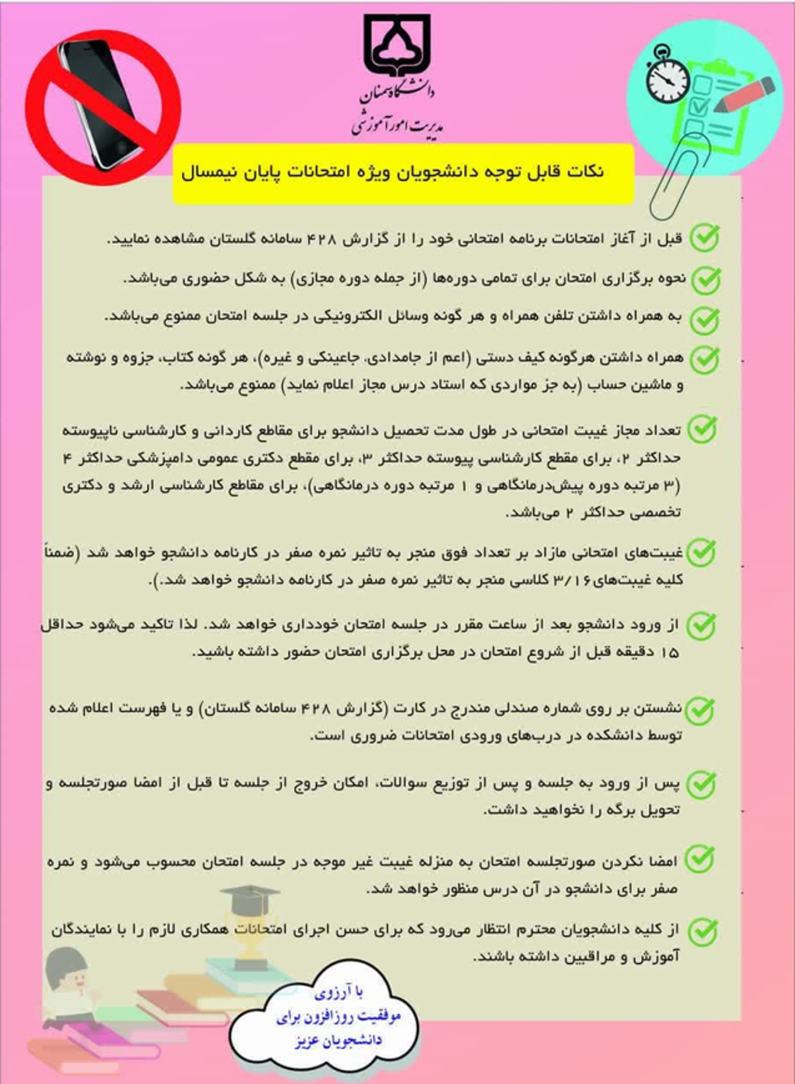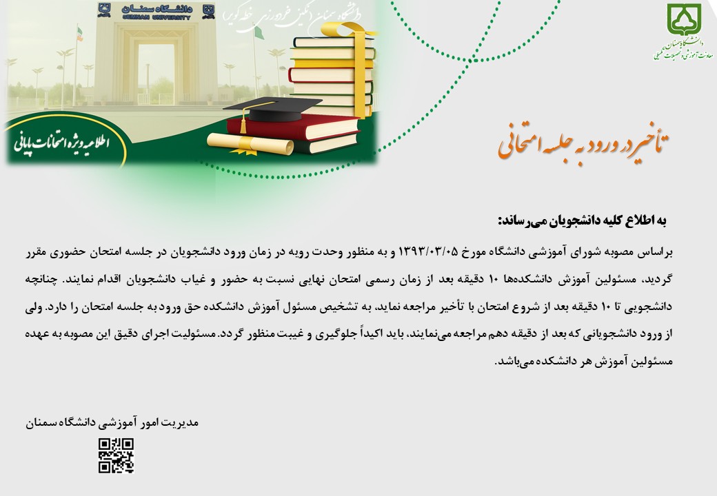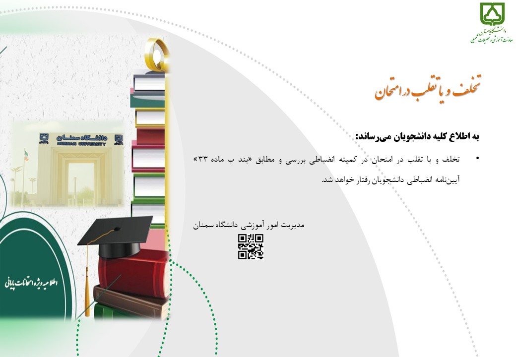 اطلاعیه امتحانات پایان نیمسال اول سال تحصیلی 1405 1404 (4041) 1404/10/17 - 10:01 تعداد بازدید: 35 کلمات کلیدی