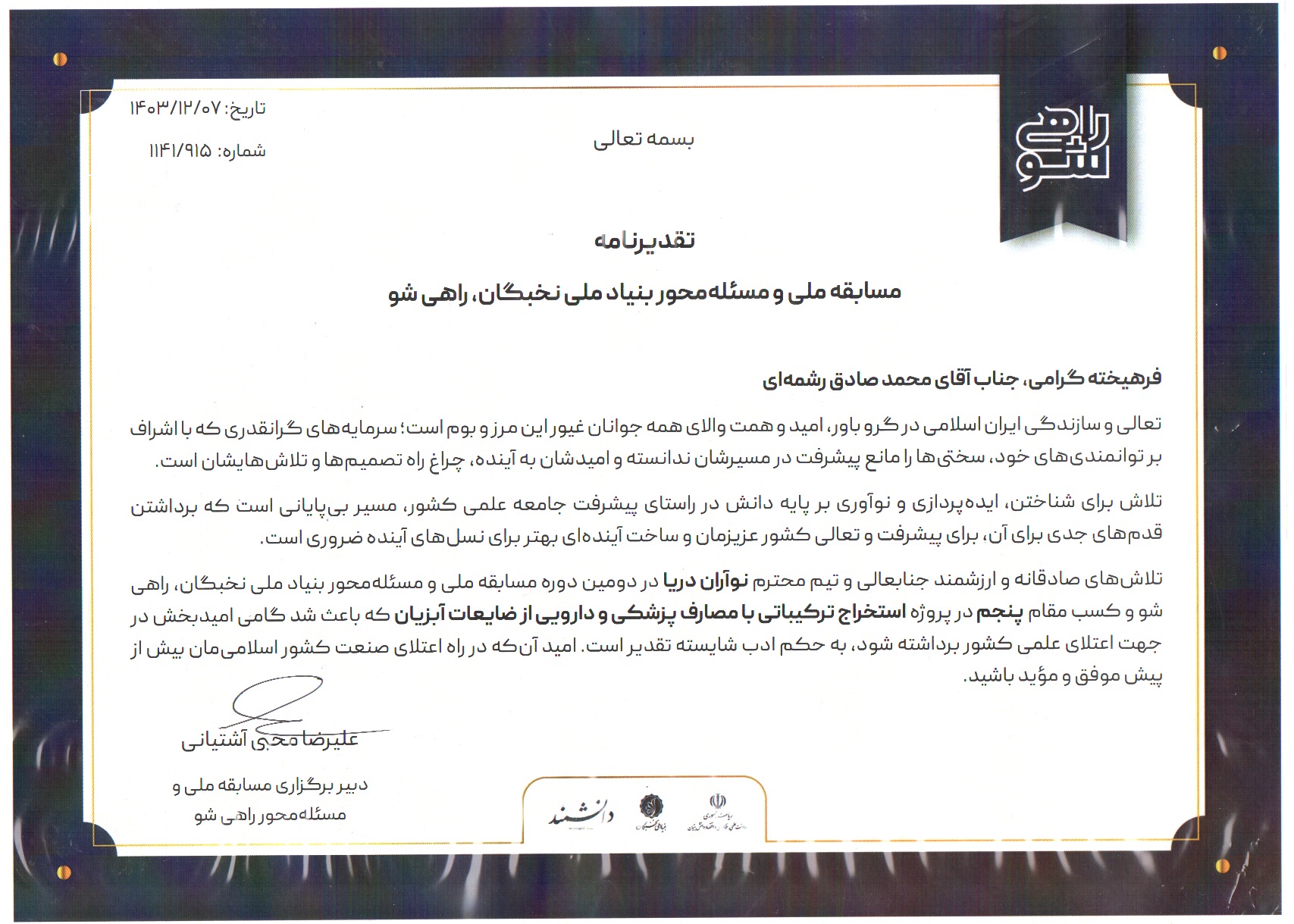 دکتر محمود احمدی همدانی معاون پژوهشی و فناوری دانشکده افزود: این دوره از مسابقه ملی راهی شو با شرکت بیش از ۱۰ هزار نفر از دانشجویان سراسر کشور برگزار شد و مراسم اختتامیه آن در تاریخ ۲۴ اردیبهشت ۱۴۰۴ در پژوهشگاه نیرو واقع در شهر تهران برگزار شد.